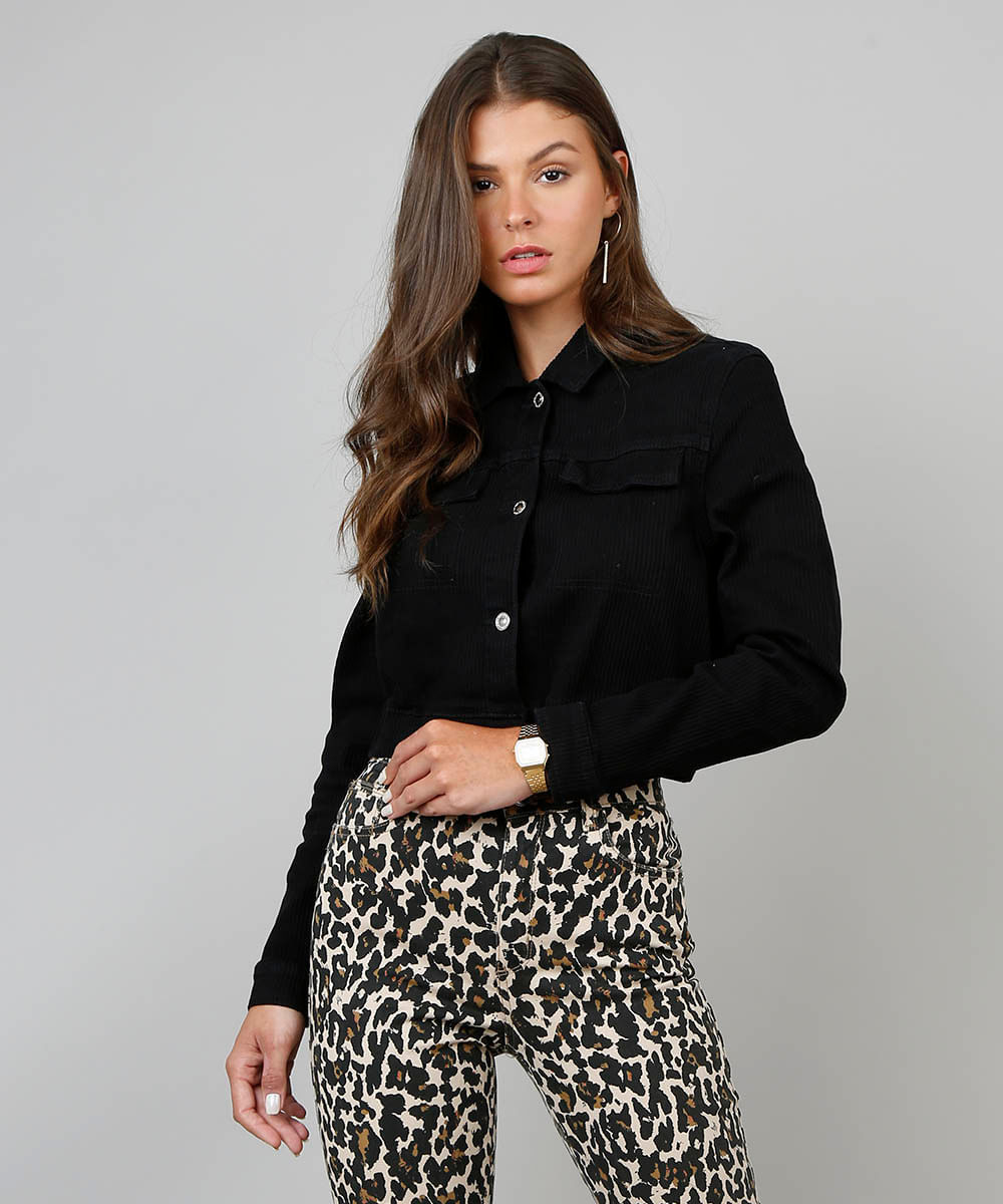 Jaqueta em Sarja Feminina Cropped Canelada Preta