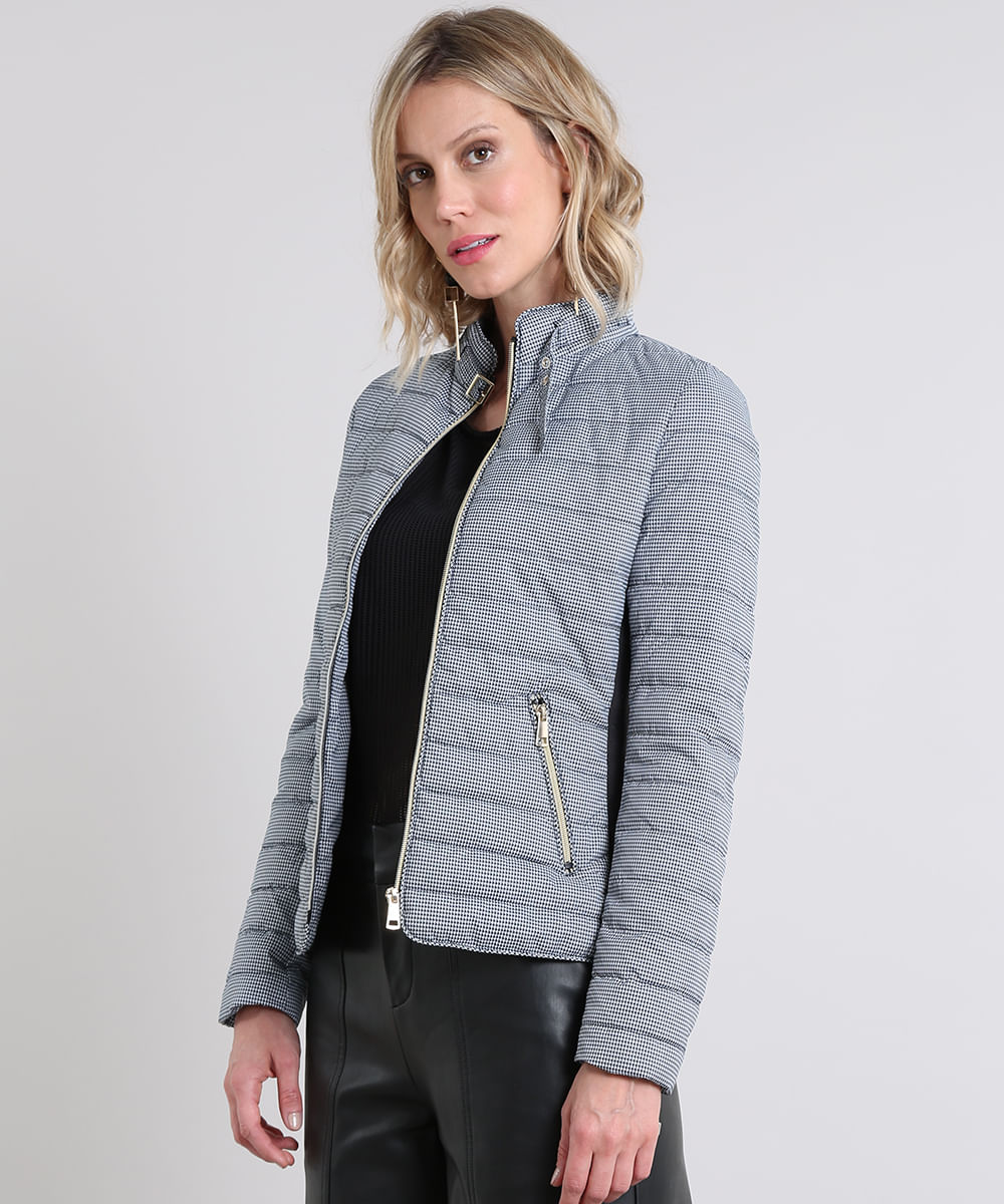 Jaqueta Feminina Puffer Estampada Pied de Poule com Fivela Preta